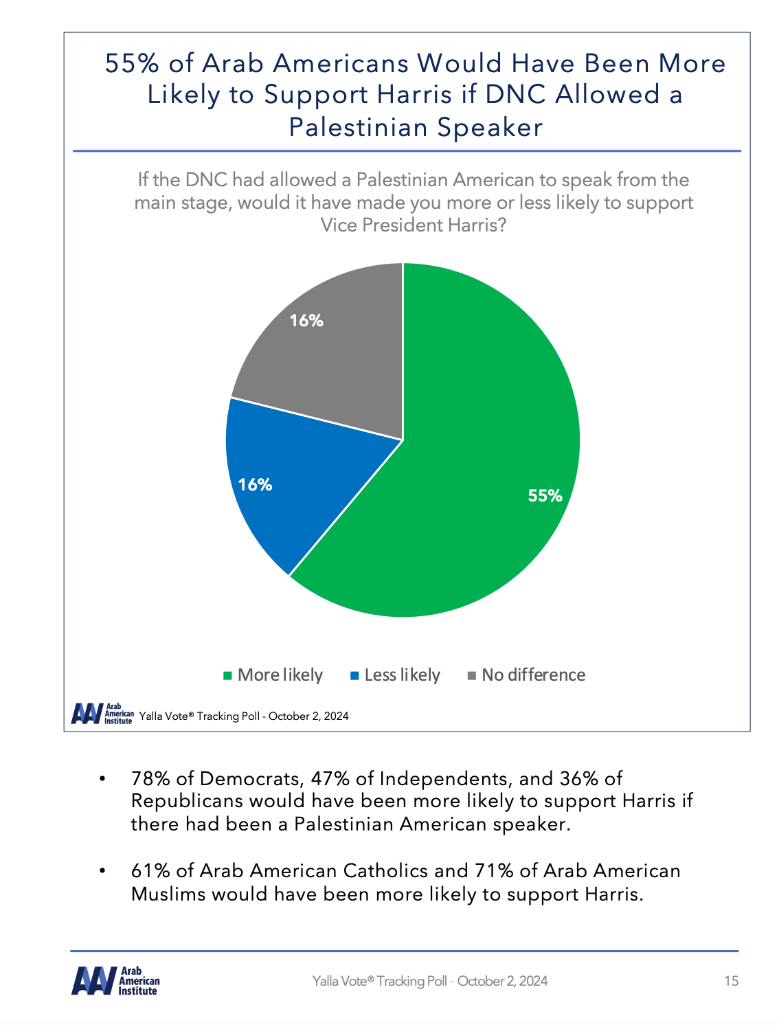 The latest poll numbers tell a stark story. A majority—55 percent—of Arab Americans told the AAIA that they would be more likely to support Harris if the DNC had allowed a Palestinian American to speak at the convention. But Harris and the DNC refused. More than 56 percent of Arab Americans said they would support Harris if she called for an end to arms shipments to Israel. But she hasn’t. Instead, the Harris campaign has offered little more than platitudes, virtual staff meetings, and a refusal to engage with the urgency that this moment demands.