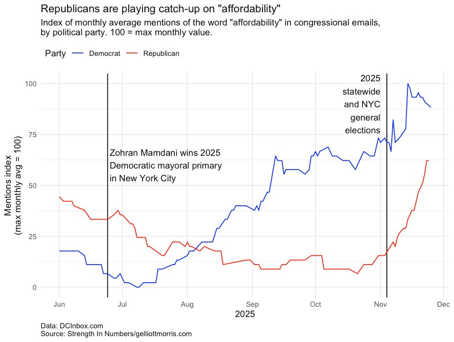 Mamdani’s primary win in June 2025 is where you see the real inflection for affordability. Democratic mentions jump and never return to their earlier baseline. It’s the moment when affordability goes from being a niche progressive word on email newsletters to a party-wide message.