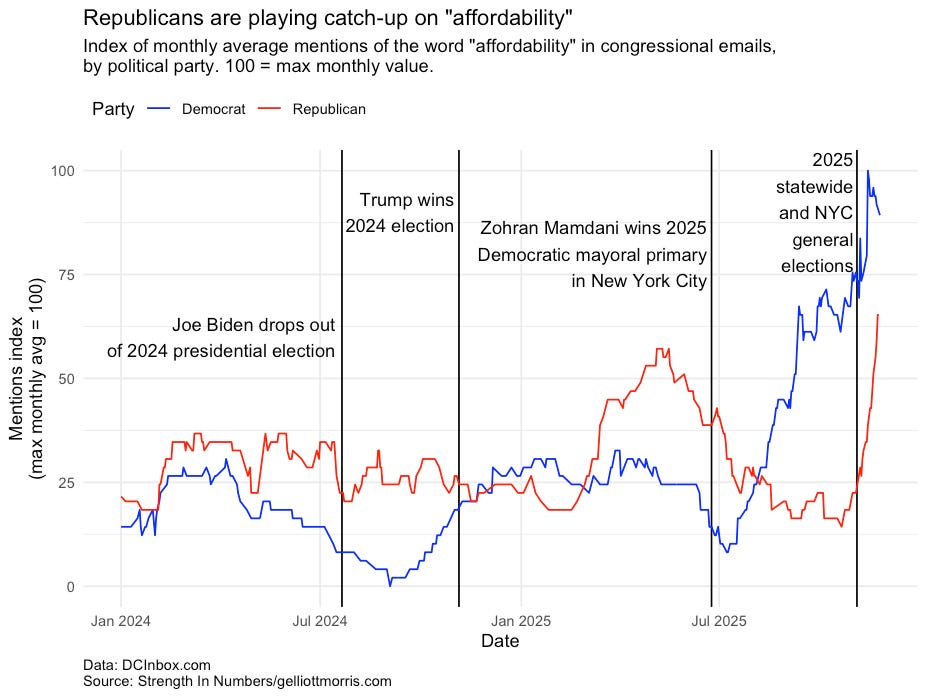 G. Elliott Morris’s innovative research tracks how often Democrats and Republicans use the word “affordability” in constituent emails. Through most of 2024, both parties sit in the middle of the chart, with Republicans actually using the term slightly more. Joe Biden drops out. Donald Trump wins the presidency. The lines barely move. Democratic mentions drift toward zero by mid-2024 and only slowly recover. As Morris writes: