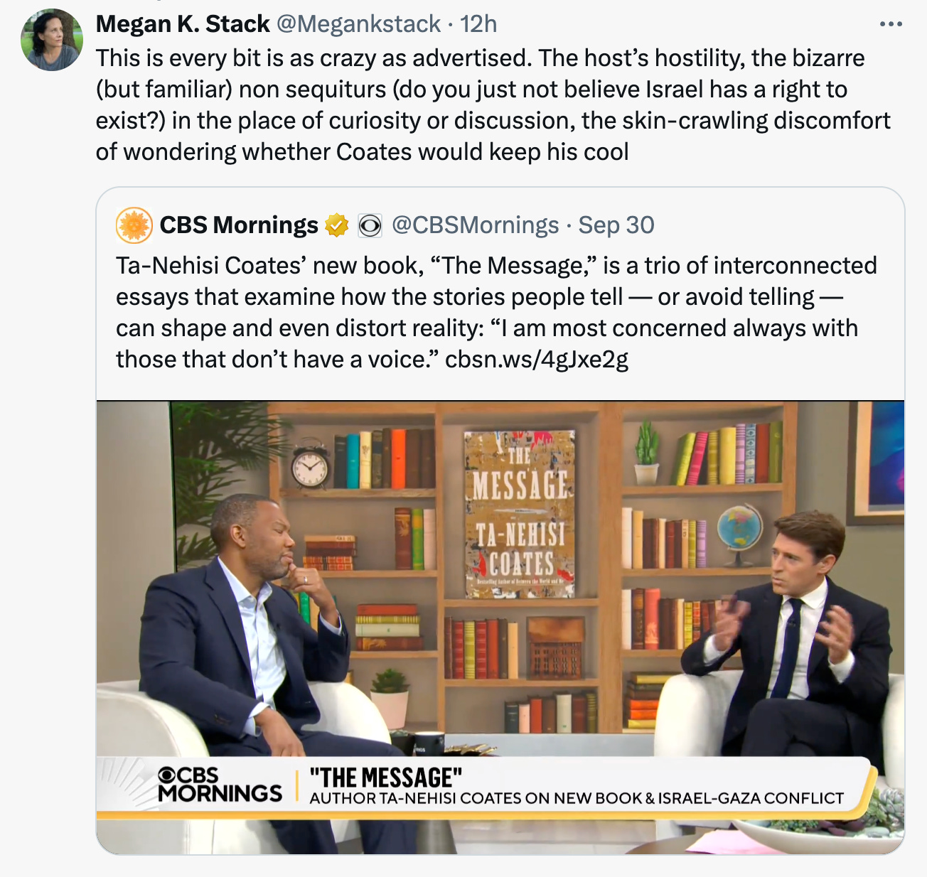 What could have been a deep, important conversation about Coates’ personal experience visiting the West Bank, the U.S.'s role in providing weapons aid to Israel, and the state of Palestinian human rights advocacy quickly became confined to a single, narrow question: "Does Israel have a right to exist?" Dokoupil even insinuated that Coates book could otherwise be mistaken as teh work of an “extremist.” Once this question is posed, everything else—human rights abuses, U.S. foreign policy, and the staggering financial and weapons support Israel receives—fades into the background. The two other Black hosts on the show barely got a word in edgewise, and even Coates, whose ability to cut through noise is remarkable, found himself wrestling with a debate that had already been constrained by this simplistic premise.