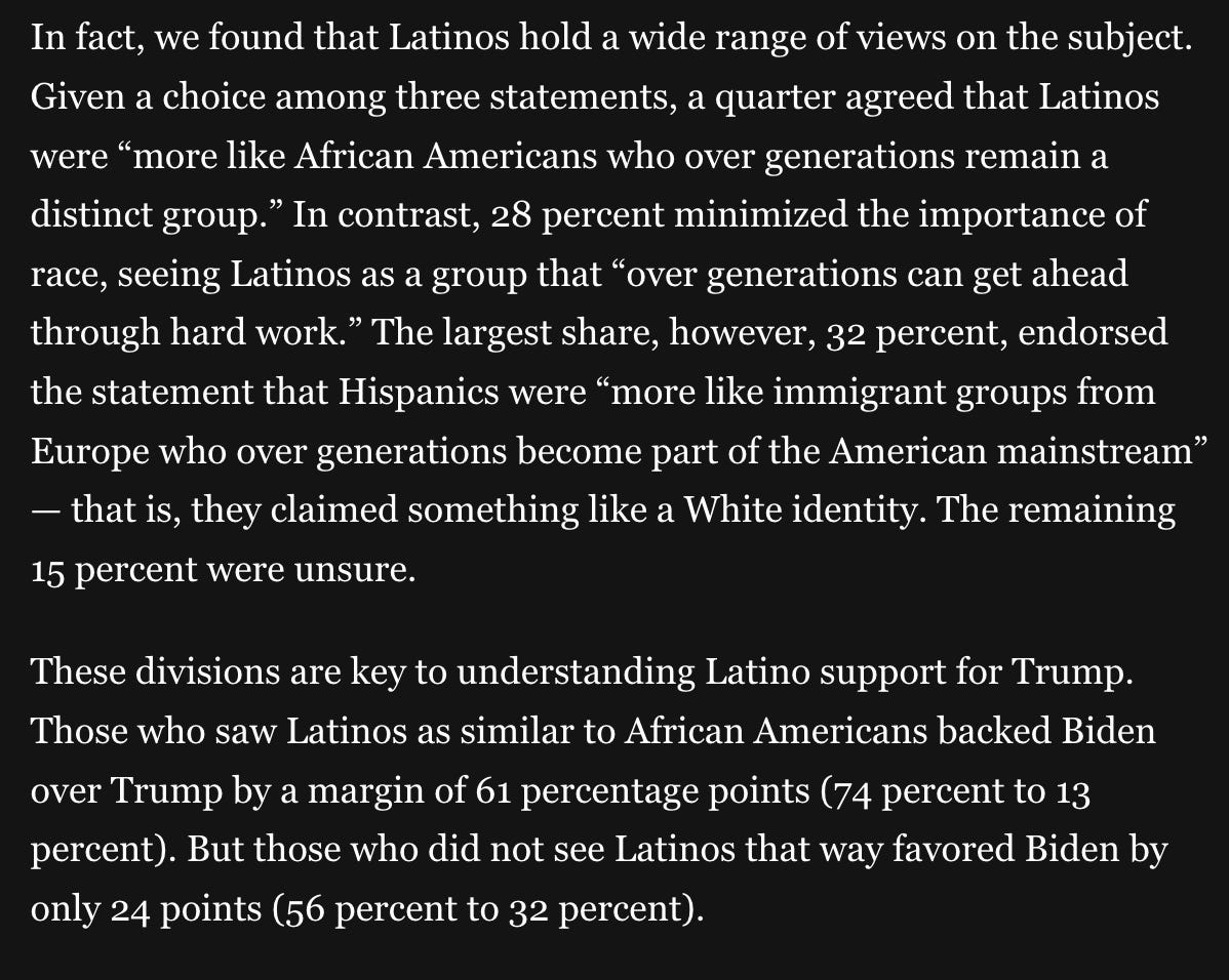 Part of what’s happening, as Haney López has documented, is not a rejection of identity politics but a shift in how identity is understood. His research shows that Latino voters don’t share a single racial self-conception. These identity frameworks align tightly with how people vote. Those who see Latinos as a marginalized racial group break heavily for Democrats. Those who see themselves as future insiders are more open to Republicans. What’s often framed as backlash is better understood as status anxiety—a hunger to be seen not as victims, but as contributors. And when Democrats offer no clear vision of belonging—no economic story, no recognition—that anxiety doesn’t go away. It just finds a different political home.