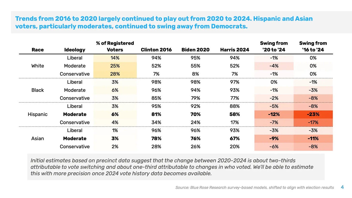The shift is hard to ignore. Naturalized citizens, whom Biden carried by 27 points in 2020, swung toward Trump by up to 23 points, according to pollster David Shor. In some immigrant-heavy counties, Trump saw double-digit gains.
