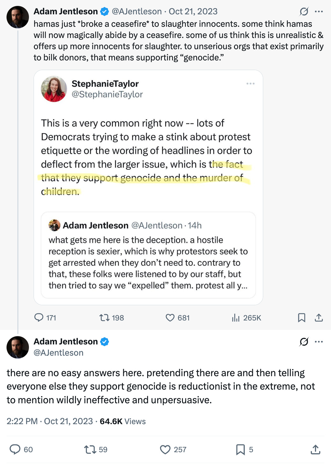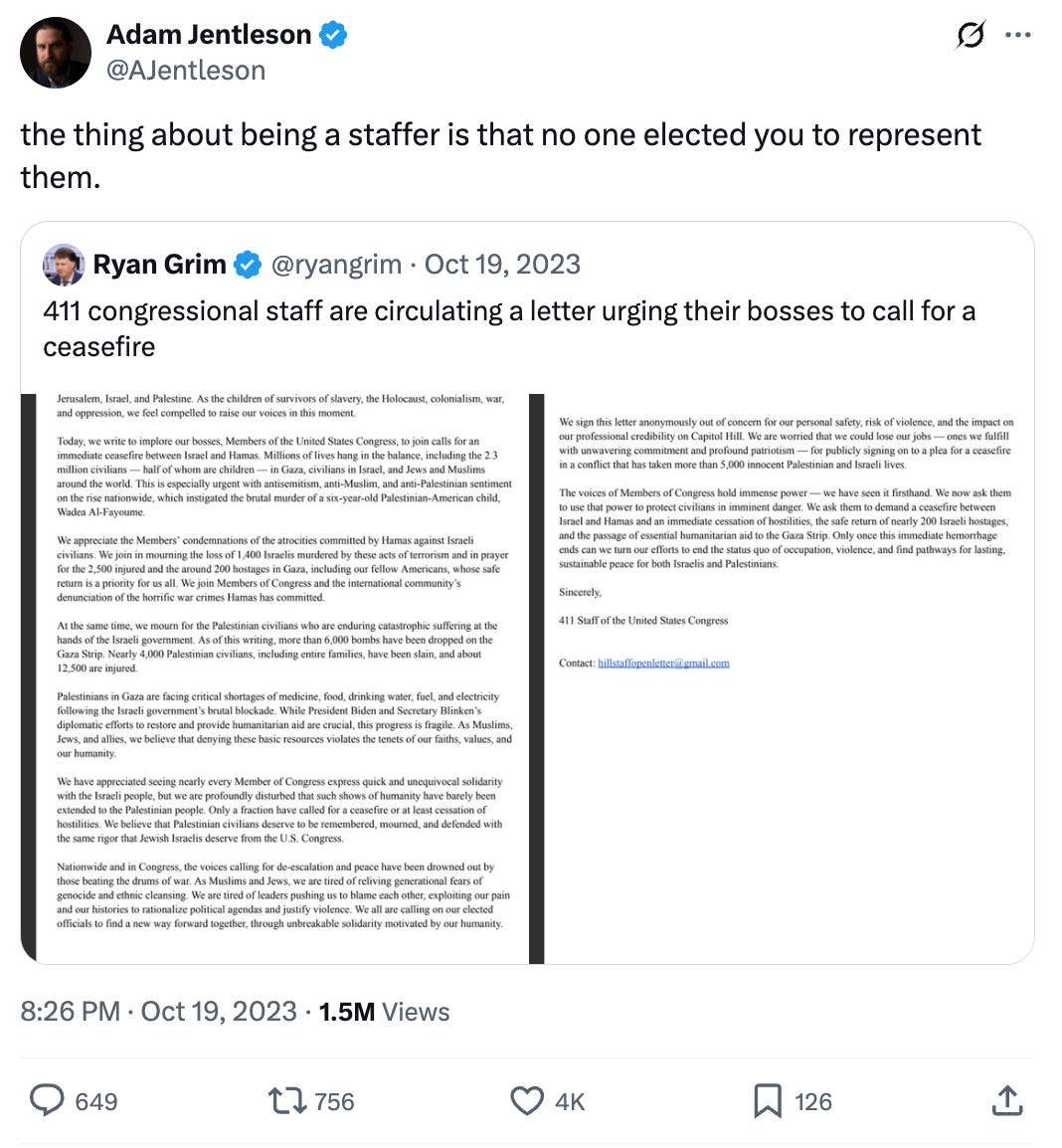 The record of Searchlight’s leadership tells another story. Many of the alumni of Fetterman’s office who now steer Searchlight spent 2023 and 2024 not merely avoiding conflict but working to contain it. They rolled their eyes at Democrats advocating for a ceasefire and weapons restrictions, dismissing them as unserious or ill-strategized, all while serving a boss who was the Senate’s loudest champion of Israel’s horrific war crimes. They offered cover for him, waving around polling to insist Fetterman’s violent positions on Israel made him more popular, sneering at dissent as unserious, childish Group-think, even as the bombing of Palestinian civilians worsened.
