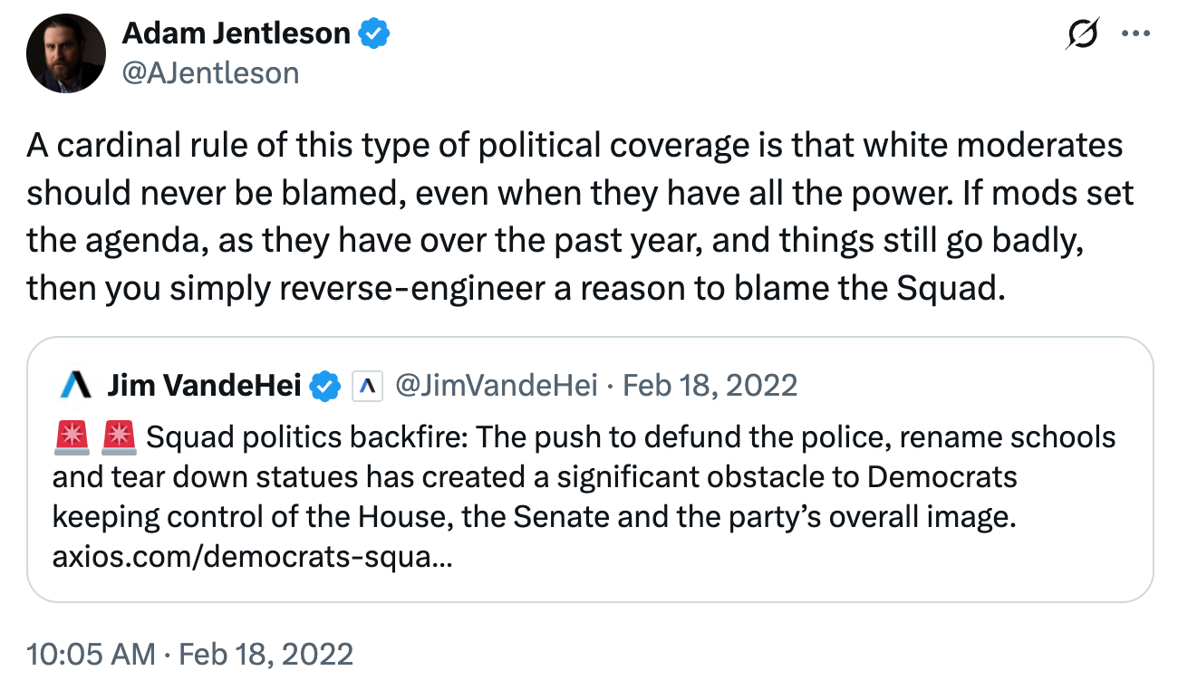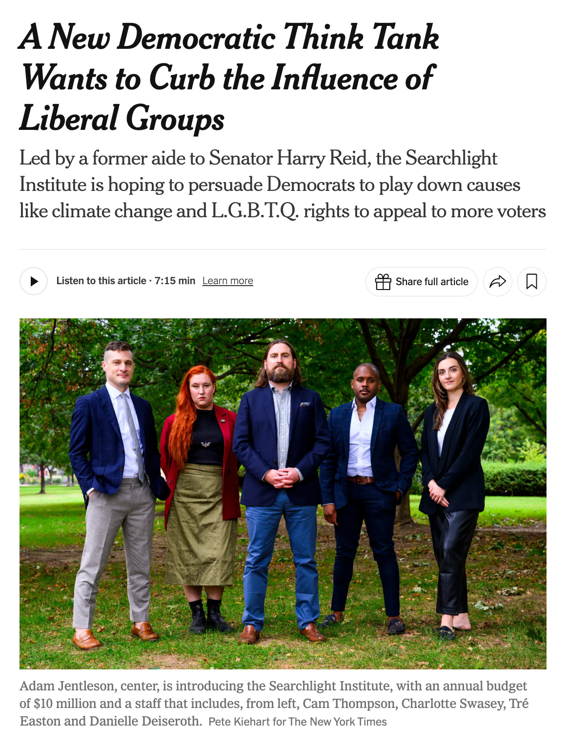 It is also hard to take seriously the idea that “the groups” cost Harris the 2024 election, when the overwhelming liabilities were inflation, Biden’s age, and a White House inner circle that often sneered at dissent (not to mention that Searchlight-adjacent thinkers like Matt Yglesias and David Shor had the ears of Democratic Party leaders). Still, in a two-party system, there will always be groups organizing constituencies to have their needs met across a range of issues; that is not a pathology but the basic structure of democratic politics. The task is not to ride the vibe-shift and wish groups away but to build better ones, bring them into greater synchronicity, and accept that conflict will always exist. How leaders navigate that conflict is what makes realignments possible.