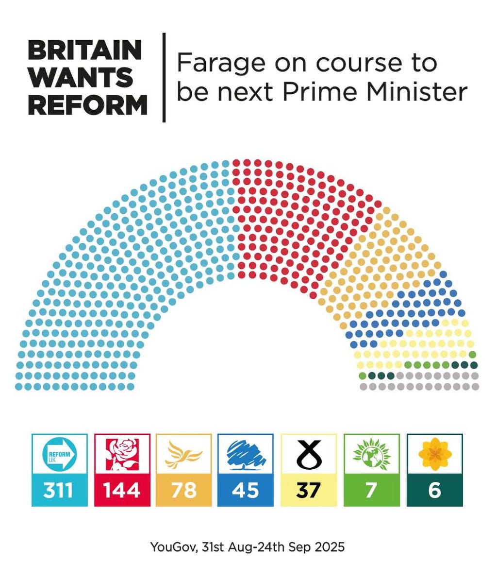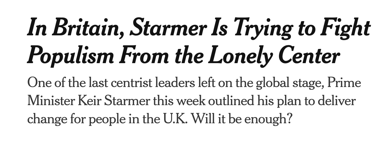 And yet, a year on, Britain is flirting with something more disruptive. Nigel Farage’s Reform UK—a populist, anti-immigration vehicle roughly analogous to a MAGA spinoff—has surged in polls and seat models, projected to wipe out Labour’s majority if an election were held today. In an information ecosystem where culture wars dominate, a political class wary of offending donors or the right, and a “middle” that drifts with media salience, moderation is easily swamped by deeper currents of identity and grievance.