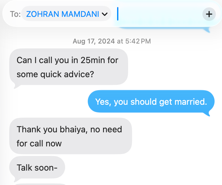 PS: If you’ve made it this far, here’s your bonus. Things are working out for ZOHRAN MAMDANI, who, like every self-respecting immigrant uncle, insists his name goes in your phone in ALL CAPS.