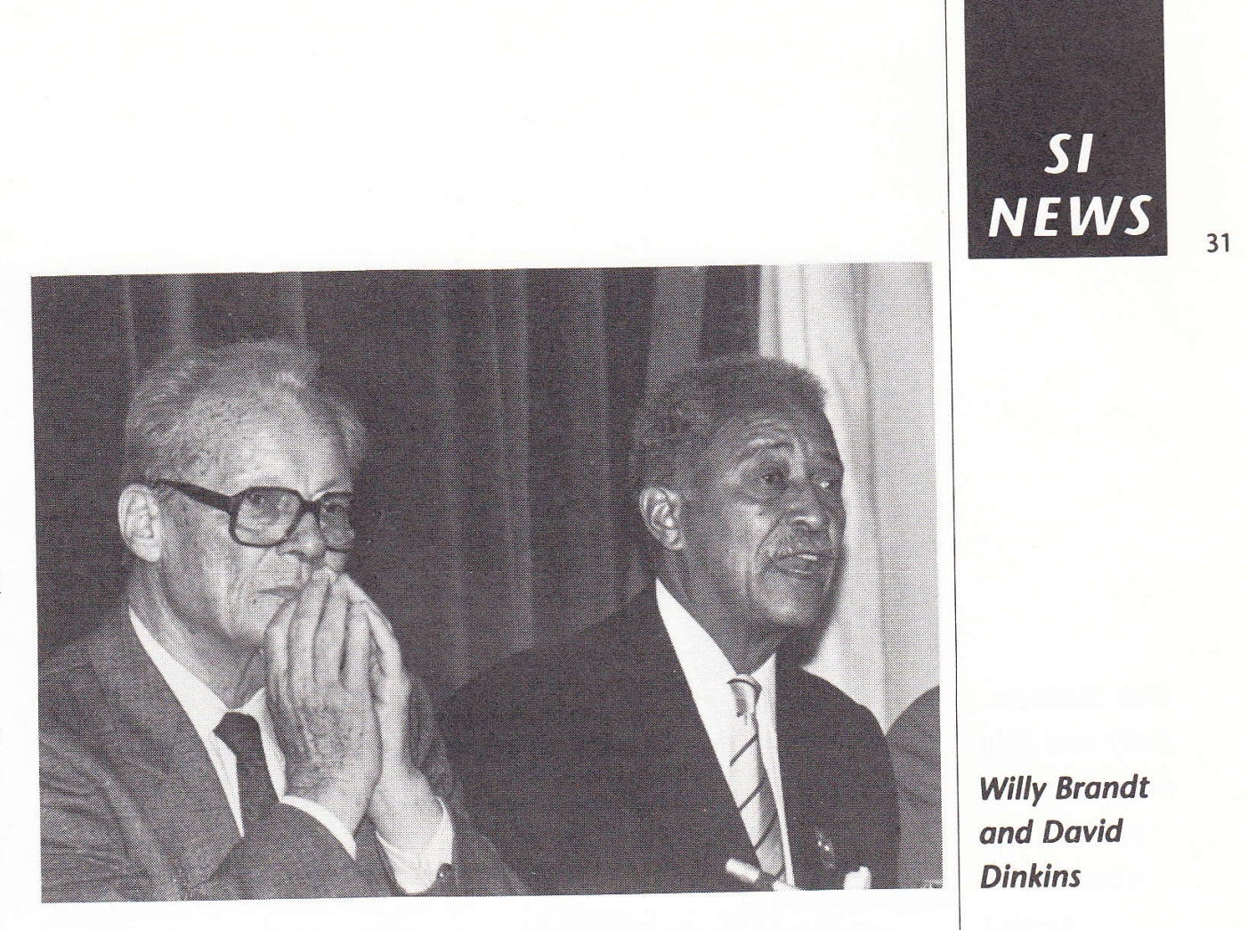 Dinkins’s relationship to this tradition wasn’t ceremonial. DSA’s magazine described him in 1989 as a “longtime DSA member.” When the Socialist International gathered in New York, he said plainly: “I am delighted to be joined by my friends from the Democratic Socialists of America, who have been strong supporters of mine all along.” He also welcomed Willy Brandt, placing New York’s fight against poverty alongside Europe’s social-democratic project.