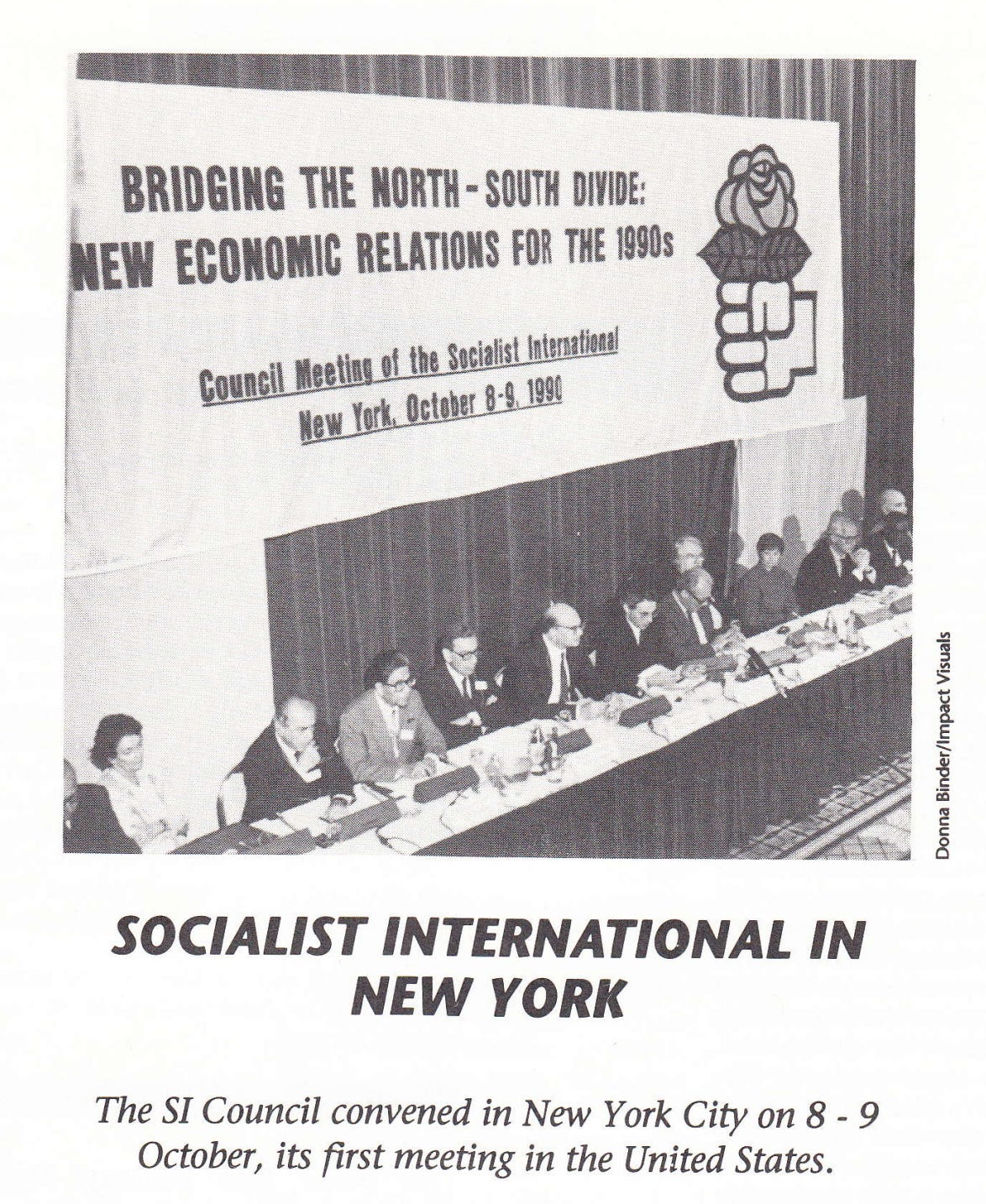 In October 1991, the Socialist International, a global association of social-democratic, socialist, and labor parties, held its first U.S. meeting in New York City on October 8–9 under the theme “Bridging the North–South Divide: New Economic Relations for the 1990s.” Mayor David Dinkins welcomed the delegates and situated New York in a global struggle for justice.
